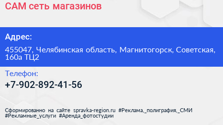 САМ, сеть магазинов по адресу 455047, Челябинская область, Магнитогорск, Советская, 160а ТЦ2 в дальнейшем Организация, размещена в следующих категориях: