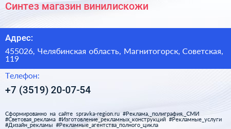 Синтез, магазин винилискожи по адресу 455026, Челябинская область, Магнитогорск, Советская, 119 в дальнейшем Организация, размещена в следующих категориях: