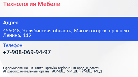 Технология Мебели по адресу 455048, Челябинская область, Магнитогорск, проспект Ленина, 119 в дальнейшем Организация, размещена в следующих категориях: