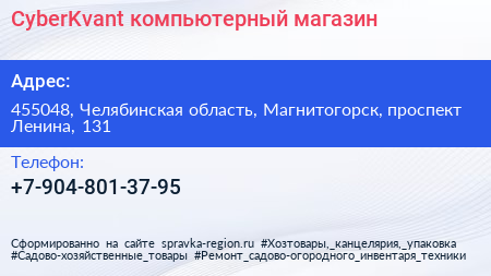 CyberKvant, компьютерный магазин по адресу 455048, Челябинская область, Магнитогорск, проспект Ленина, 131 в дальнейшем Организация, размещена в следующих категориях: