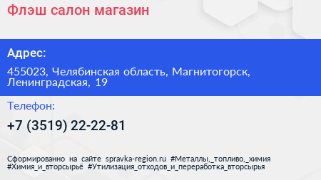 Флэш, салон-магазин по адресу 455023, Челябинская область, Магнитогорск, Ленинградская, 19 в дальнейшем Организация, размещена в следующих категориях: