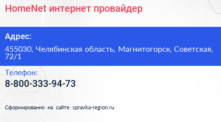 HomeNet, интернет-провайдер по адресу 455030, Челябинская область, Магнитогорск, Советская, 72/1 в дальнейшем Организация, размещена в следующих категориях: