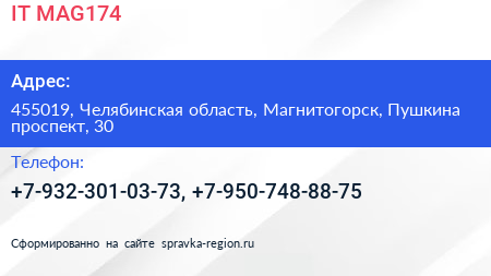 IT-MAG174 по адресу 455019, Челябинская область, Магнитогорск, Пушкина проспект, 30 в дальнейшем Организация, размещена в следующих категориях: