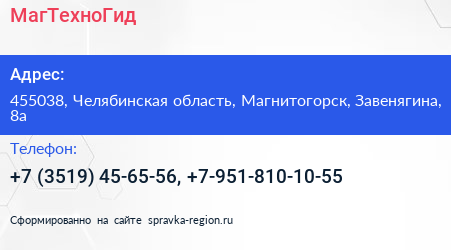 МагТехноГид по адресу 455038, Челябинская область, Магнитогорск, Завенягина, 8а в дальнейшем Организация, размещена в следующих категориях:
