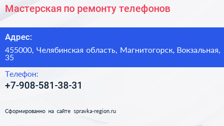 Мастерская по ремонту телефонов по адресу 455000, Челябинская область, Магнитогорск, Вокзальная, 35 в дальнейшем Организация, размещена в следующих категориях: