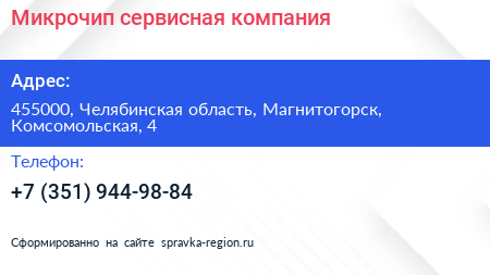 Микрочип, сервисная компания по адресу 455000, Челябинская область, Магнитогорск, Комсомольская, 4 в дальнейшем Организация, размещена в следующих категориях:
