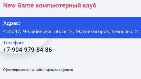 New Game, компьютерный клуб по адресу 455047, Челябинская область, Магнитогорск, Тевосяна, 2 в дальнейшем Организация, размещена в следующих категориях: