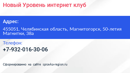 Новый Уровень, интернет-клуб по адресу 455051, Челябинская область, Магнитогорск, 50-летия Магнитки, 38а в дальнейшем Организация, размещена в следующих категориях: