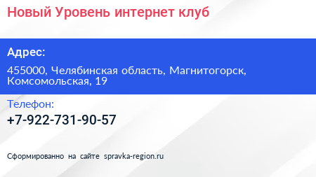 Новый Уровень, интернет-клуб по адресу 455000, Челябинская область, Магнитогорск, Комсомольская, 19 в дальнейшем Организация, размещена в следующих категориях: