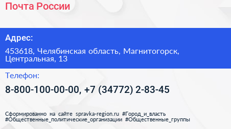 Почта России по адресу 453618, Челябинская область, Магнитогорск, Центральная, 13 в дальнейшем Организация, размещена в следующих категориях: