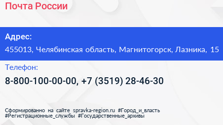 Почта России по адресу 455013, Челябинская область, Магнитогорск, Лазника, 15 в дальнейшем Организация, размещена в следующих категориях: