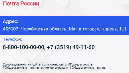 Почта России по адресу 455007, Челябинская область, Магнитогорск, Кирова, 111 в дальнейшем Организация, размещена в следующих категориях: