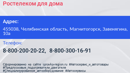 Ростелеком для дома по адресу 455038, Челябинская область, Магнитогорск, Завенягина, 10а в дальнейшем Организация, размещена в следующих категориях: