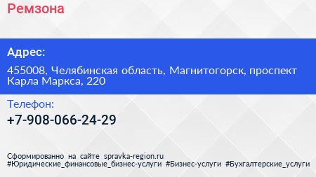 Ремзона по адресу 455008, Челябинская область, Магнитогорск, проспект Карла Маркса, 220 в дальнейшем Организация, размещена в следующих категориях: