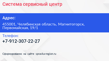Система, сервисный центр по адресу 455001, Челябинская область, Магнитогорск, Первомайская, 19/1 в дальнейшем Организация, размещена в следующих категориях: