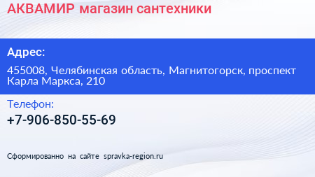АКВАМИР, магазин сантехники по адресу 455008, Челябинская область, Магнитогорск, проспект Карла Маркса, 210 в дальнейшем Организация, размещена в следующих категориях: