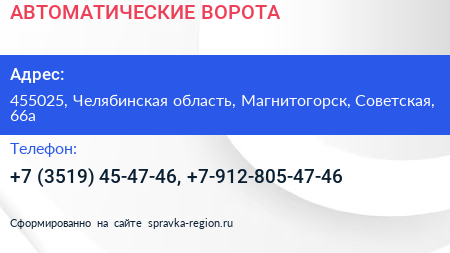 АВТОМАТИЧЕСКИЕ ВОРОТА по адресу 455025, Челябинская область, Магнитогорск, Советская, 66а в дальнейшем Организация, размещена в следующих категориях: