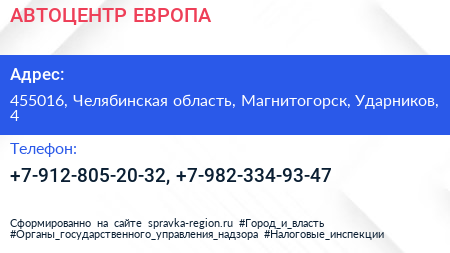 АВТОЦЕНТР ЕВРОПА по адресу 455016, Челябинская область, Магнитогорск, Ударников, 4 в дальнейшем Организация, размещена в следующих категориях: