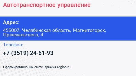 Автотранспортное управление по адресу 455007, Челябинская область, Магнитогорск, Пржевальского, 4 в дальнейшем Организация, размещена в следующих категориях: