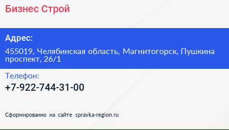 Бизнес-Строй+ по адресу 455019, Челябинская область, Магнитогорск, Пушкина проспект, 26/1 в дальнейшем Организация, размещена в следующих категориях: