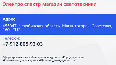 Электро спектр, магазин светотехники по адресу 455047, Челябинская область, Магнитогорск, Советская, 160а ТЦ2 в дальнейшем Организация, размещена в следующих категориях: