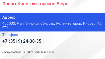 ЭнергоКонструкторское Бюро по адресу 455000, Челябинская область, Магнитогорск, Кирова, 42 ст1 в дальнейшем Организация, размещена в следующих категориях:
