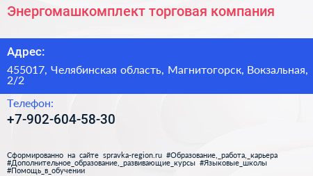 Энергомашкомплект, торговая компания по адресу 455017, Челябинская область, Магнитогорск, Вокзальная, 2/2 в дальнейшем Организация, размещена в следующих категориях: