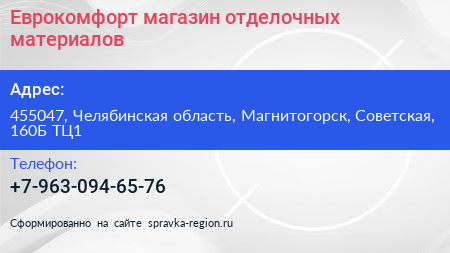 Еврокомфорт, магазин отделочных материалов по адресу 455047, Челябинская область, Магнитогорск, Советская, 160Б ТЦ1 в дальнейшем Организация, размещена в следующих категориях: