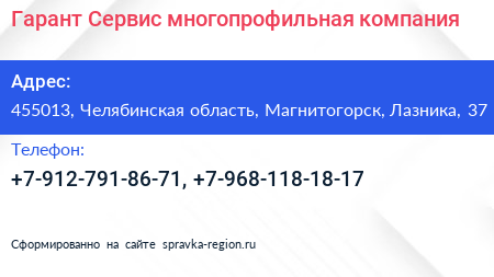 Гарант Сервис, многопрофильная компания по адресу 455013, Челябинская область, Магнитогорск, Лазника, 37 в дальнейшем Организация, размещена в следующих категориях: