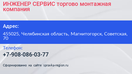 ИНЖЕНЕР-СЕРВИС, торгово-монтажная компания по адресу 455025, Челябинская область, Магнитогорск, Советская, 70 в дальнейшем Организация, размещена в следующих категориях:
