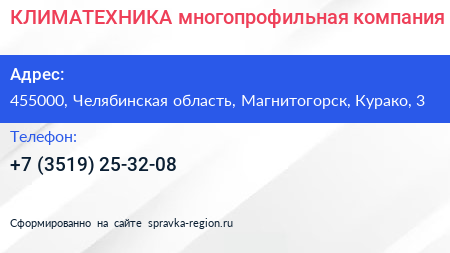 КЛИМАТЕХНИКА, многопрофильная компания по адресу 455000, Челябинская область, Магнитогорск, Курако, 3 в дальнейшем Организация, размещена в следующих категориях: