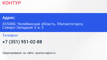 КОНТУР по адресу 455000, Челябинская область, Магнитогорск, Северо-Западная 1-я, 5 в дальнейшем Организация, размещена в следующих категориях: