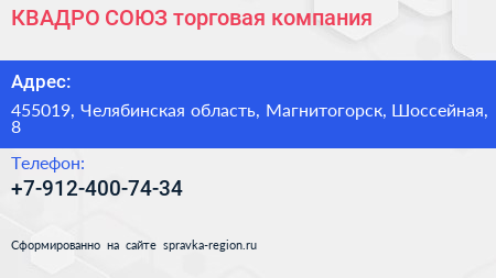 КВАДРО-СОЮЗ, торговая компания по адресу 455019, Челябинская область, Магнитогорск, Шоссейная, 8 в дальнейшем Организация, размещена в следующих категориях: