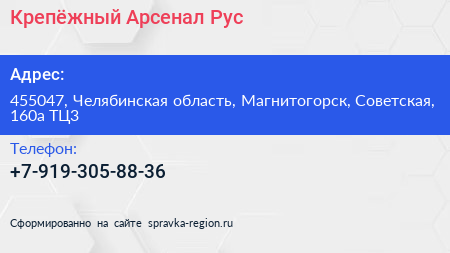 Крепёжный Арсенал Рус по адресу 455047, Челябинская область, Магнитогорск, Советская, 160а ТЦ3 в дальнейшем Организация, размещена в следующих категориях: