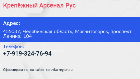 Крепёжный Арсенал Рус по адресу 455037, Челябинская область, Магнитогорск, проспект Ленина, 104 в дальнейшем Организация, размещена в следующих категориях: