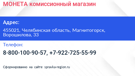 МОНЕТА, комиссионный магазин по адресу 455021, Челябинская область, Магнитогорск, Ворошилова, 33 в дальнейшем Организация, размещена в следующих категориях: