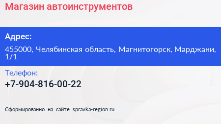 Магазин автоинструментов по адресу 455000, Челябинская область, Магнитогорск, Марджани, 1/1 в дальнейшем Организация, размещена в следующих категориях: