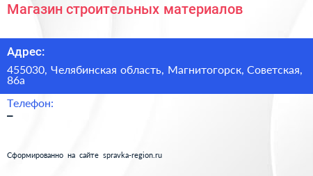 Магазин строительных материалов по адресу 455030, Челябинская область, Магнитогорск, Советская, 86а в дальнейшем Организация, размещена в следующих категориях: