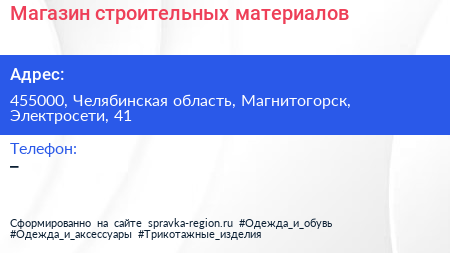 Магазин строительных материалов по адресу 455000, Челябинская область, Магнитогорск, Электросети, 41 в дальнейшем Организация, размещена в следующих категориях: