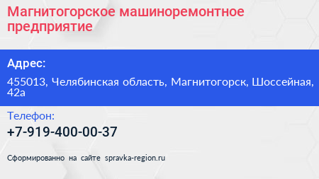 Магнитогорское машиноремонтное предприятие по адресу 455013, Челябинская область, Магнитогорск, Шоссейная, 42а в дальнейшем Организация, размещена в следующих категориях:
