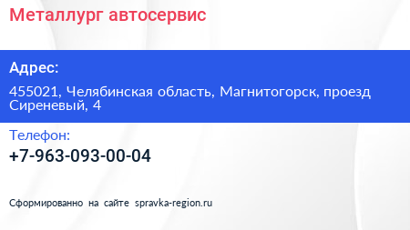 Металлург, автосервис по адресу 455021, Челябинская область, Магнитогорск, проезд Сиреневый, 4 в дальнейшем Организация, размещена в следующих категориях: