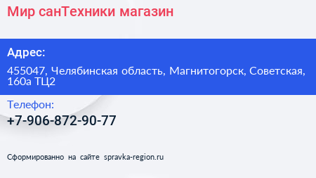 Мир санТехники, магазин по адресу 455047, Челябинская область, Магнитогорск, Советская, 160а ТЦ2 в дальнейшем Организация, размещена в следующих категориях:
