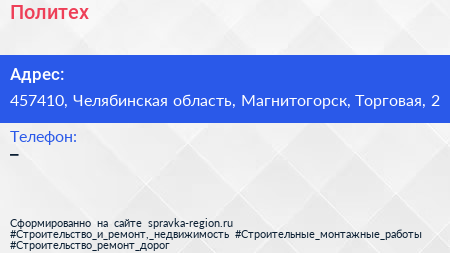 Политех по адресу 457410, Челябинская область, Магнитогорск, Торговая, 2 в дальнейшем Организация, размещена в следующих категориях: