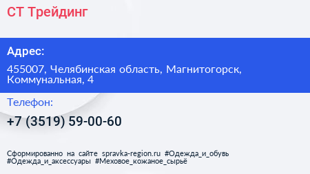СТ Трейдинг по адресу 455007, Челябинская область, Магнитогорск, Коммунальная, 4 в дальнейшем Организация, размещена в следующих категориях: