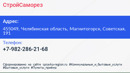 СтройСаморез по адресу 455049, Челябинская область, Магнитогорск, Советская, 191 в дальнейшем Организация, размещена в следующих категориях: