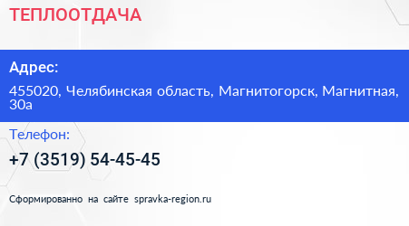 ТЕПЛООТДАЧА по адресу 455020, Челябинская область, Магнитогорск, Магнитная, 30а в дальнейшем Организация, размещена в следующих категориях: