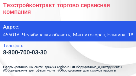 Техстройконтракт, торгово-сервисная компания по адресу 455016, Челябинская область, Магнитогорск, Елькина, 18 в дальнейшем Организация, размещена в следующих категориях:
