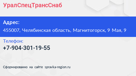 УралСпецТрансСнаб по адресу 455007, Челябинская область, Магнитогорск, 9 Мая, 9 в дальнейшем Организация, размещена в следующих категориях: