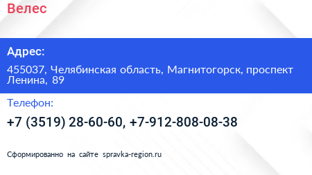 Велес по адресу 455037, Челябинская область, Магнитогорск, проспект Ленина, 89 в дальнейшем Организация, размещена в следующих категориях: