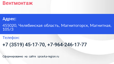 Вентмонтаж по адресу 455020, Челябинская область, Магнитогорск, Магнитная, 105/3 в дальнейшем Организация, размещена в следующих категориях: